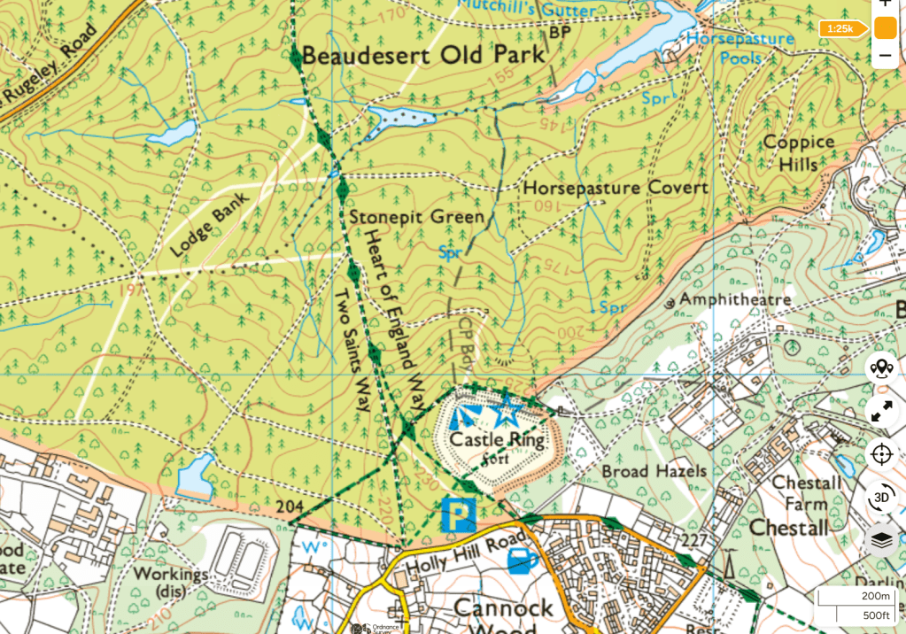 Castle Ring can be found at the edge of the village of Cannock Wood. There is a large free car park, off Holly Hill Road and opposite the Park Gate Inn. For walkers, a circular route can be taken around the top of the monument via steps from the car park as well as further out on longer walks off into the adjoining Beaudesert Old Park and Cannock Chase as well as access to the Heart of England Way and Two Saints Way long distance walks.